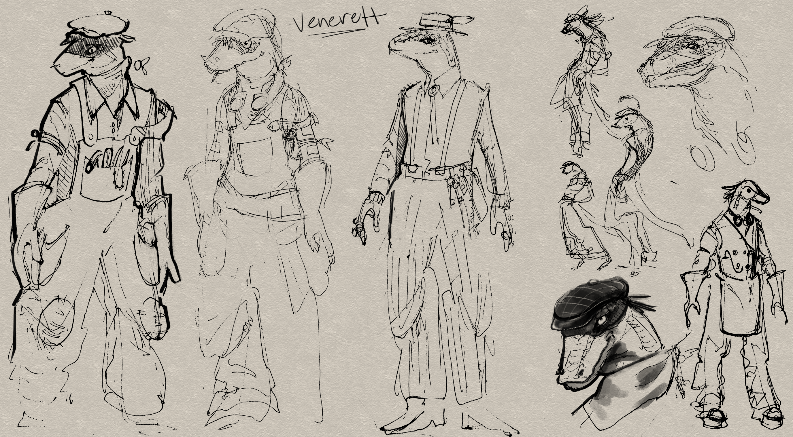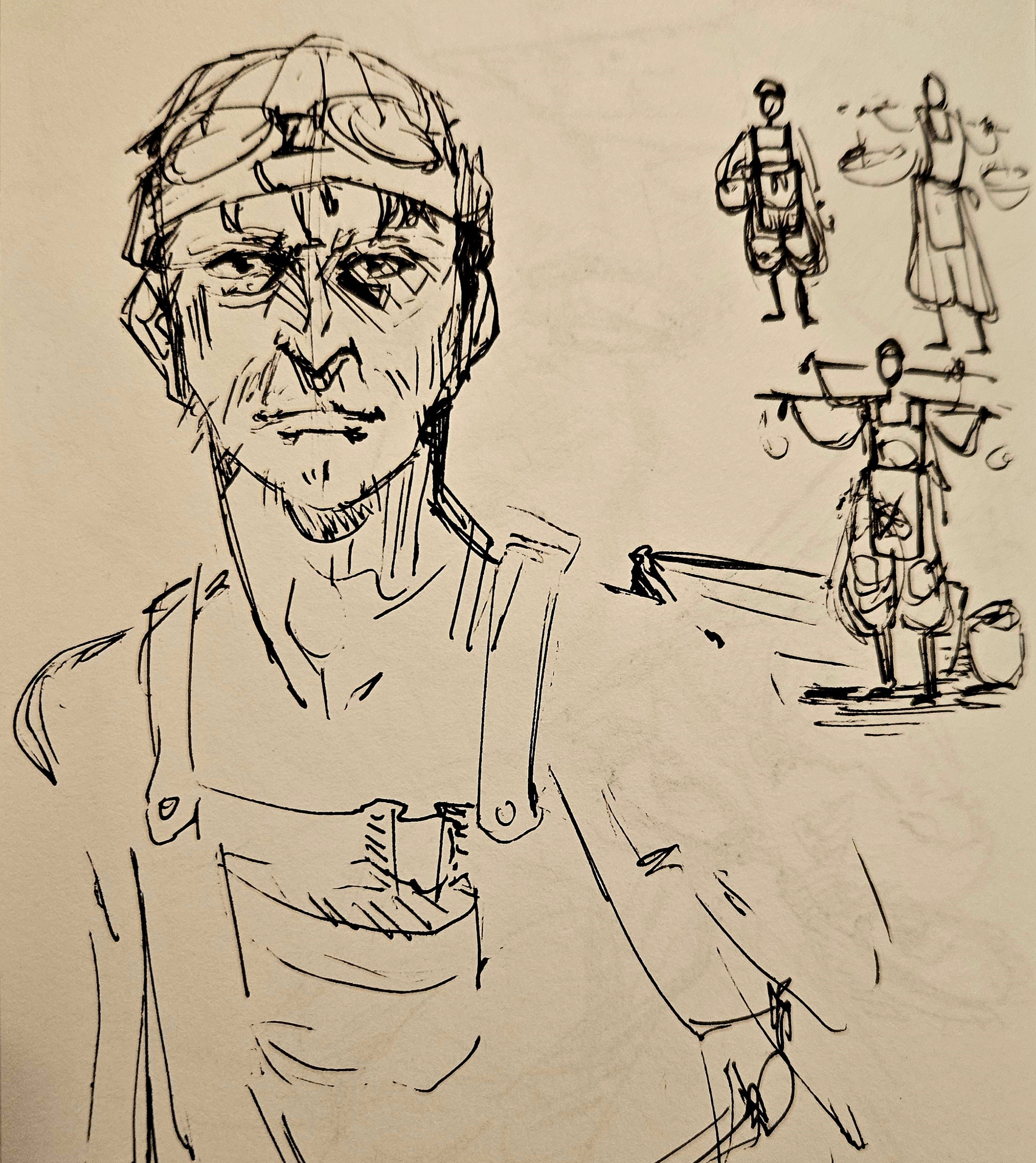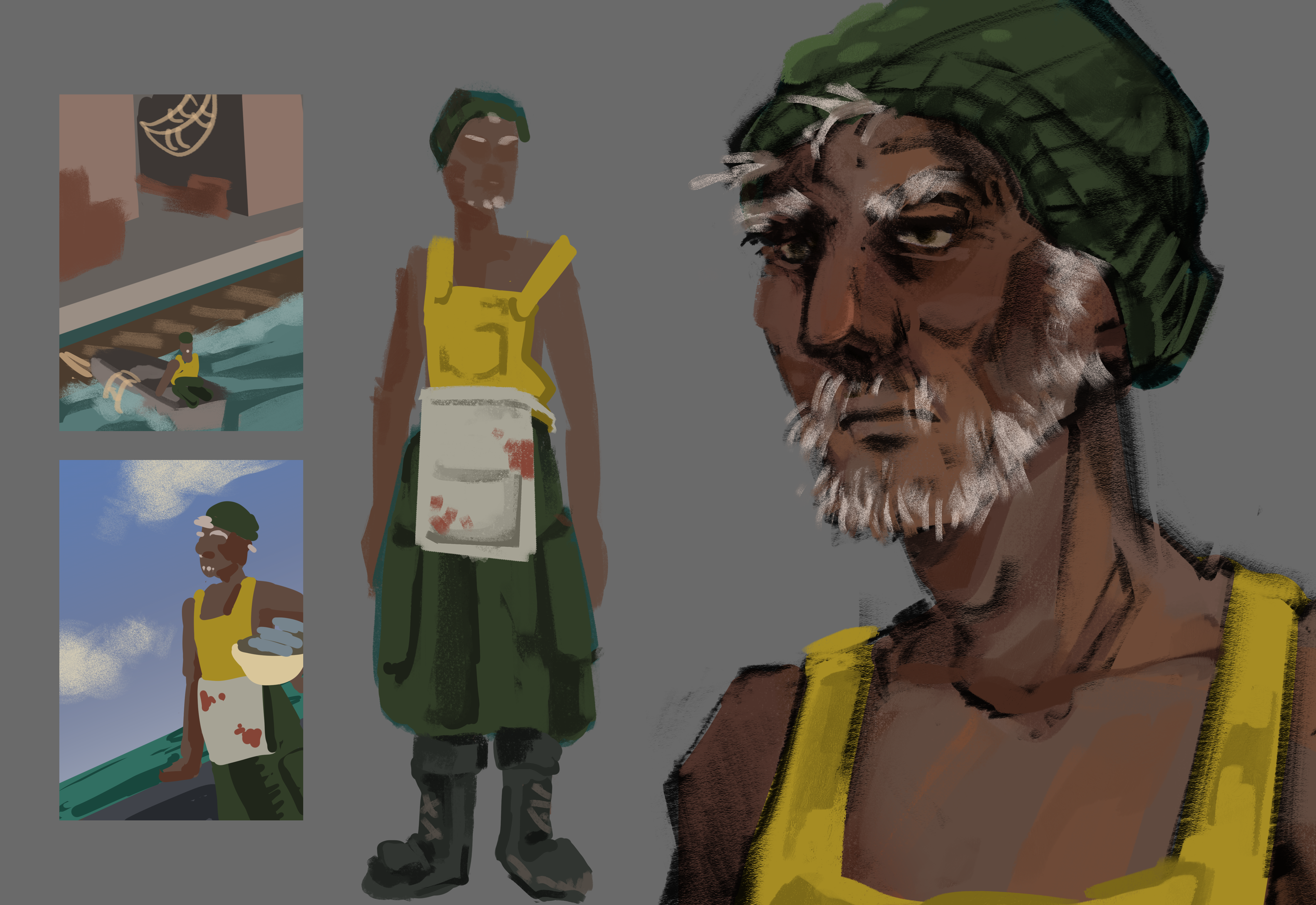 Character design exercise of a fisherman. Pictured are preliminary sketches, and a more fleshed-out character mockup with environmental thumbnails.