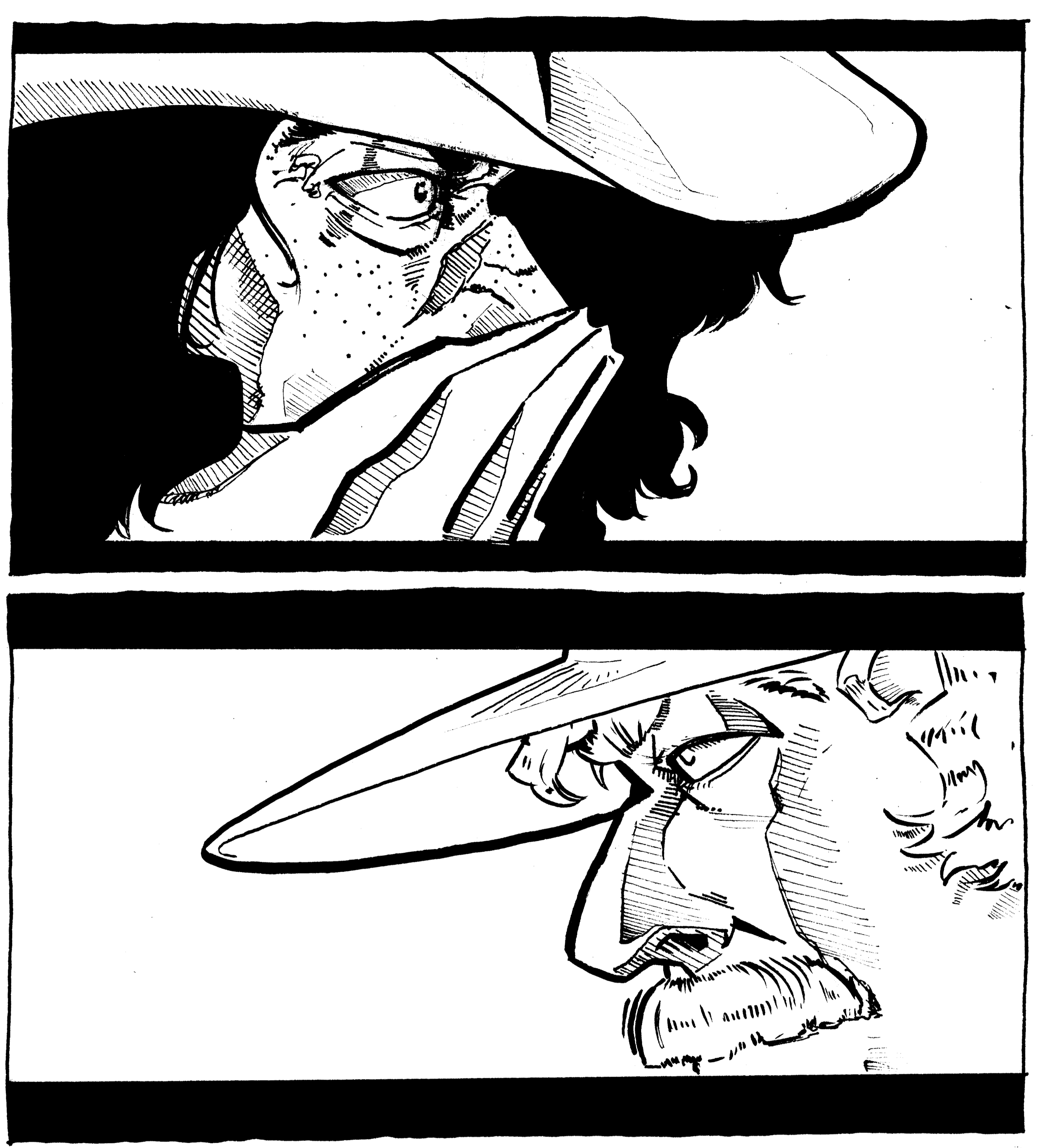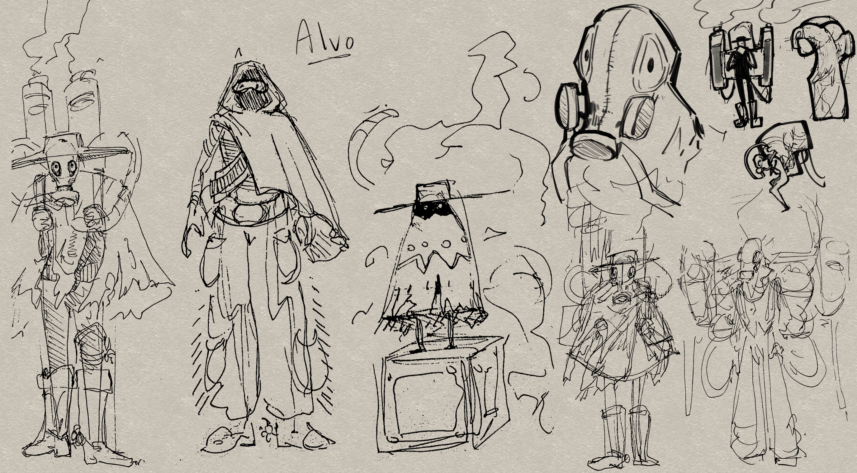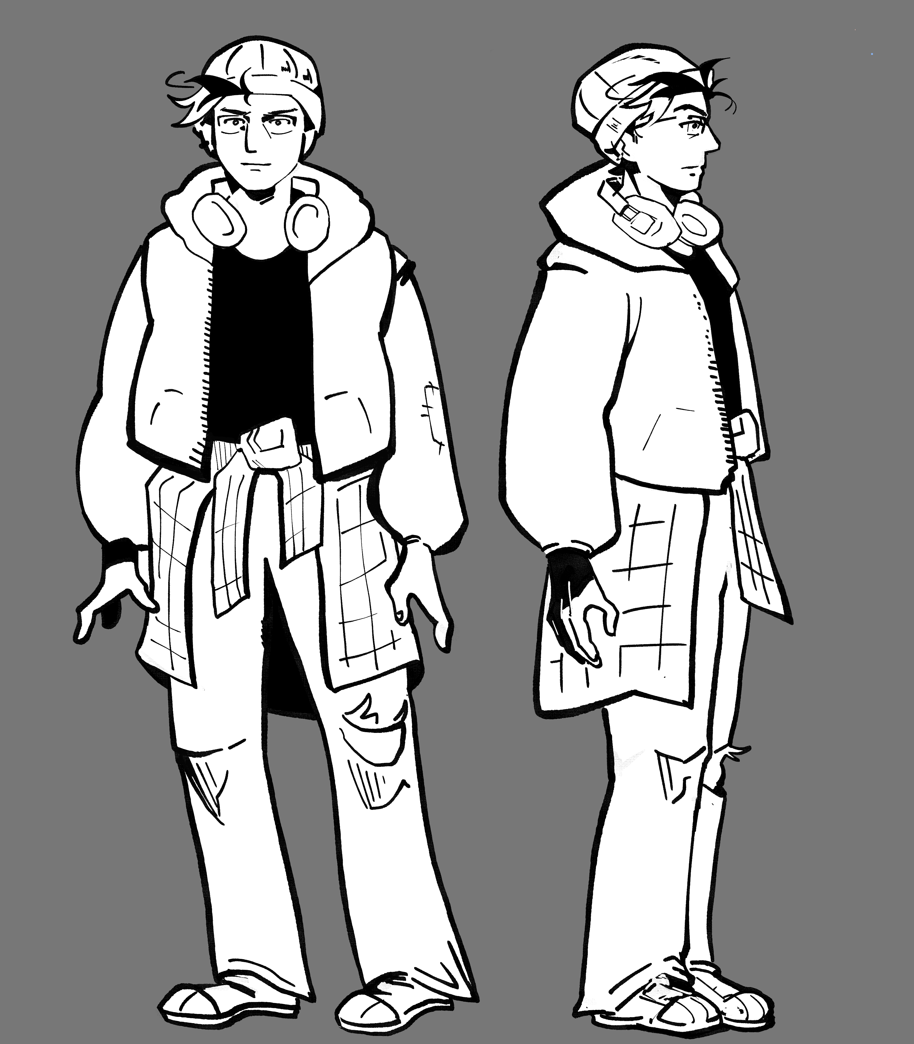 Character design exercise of a fisherman. Pictured are preliminary sketches, and a more fleshed-out character mockup with environmental thumbnails.