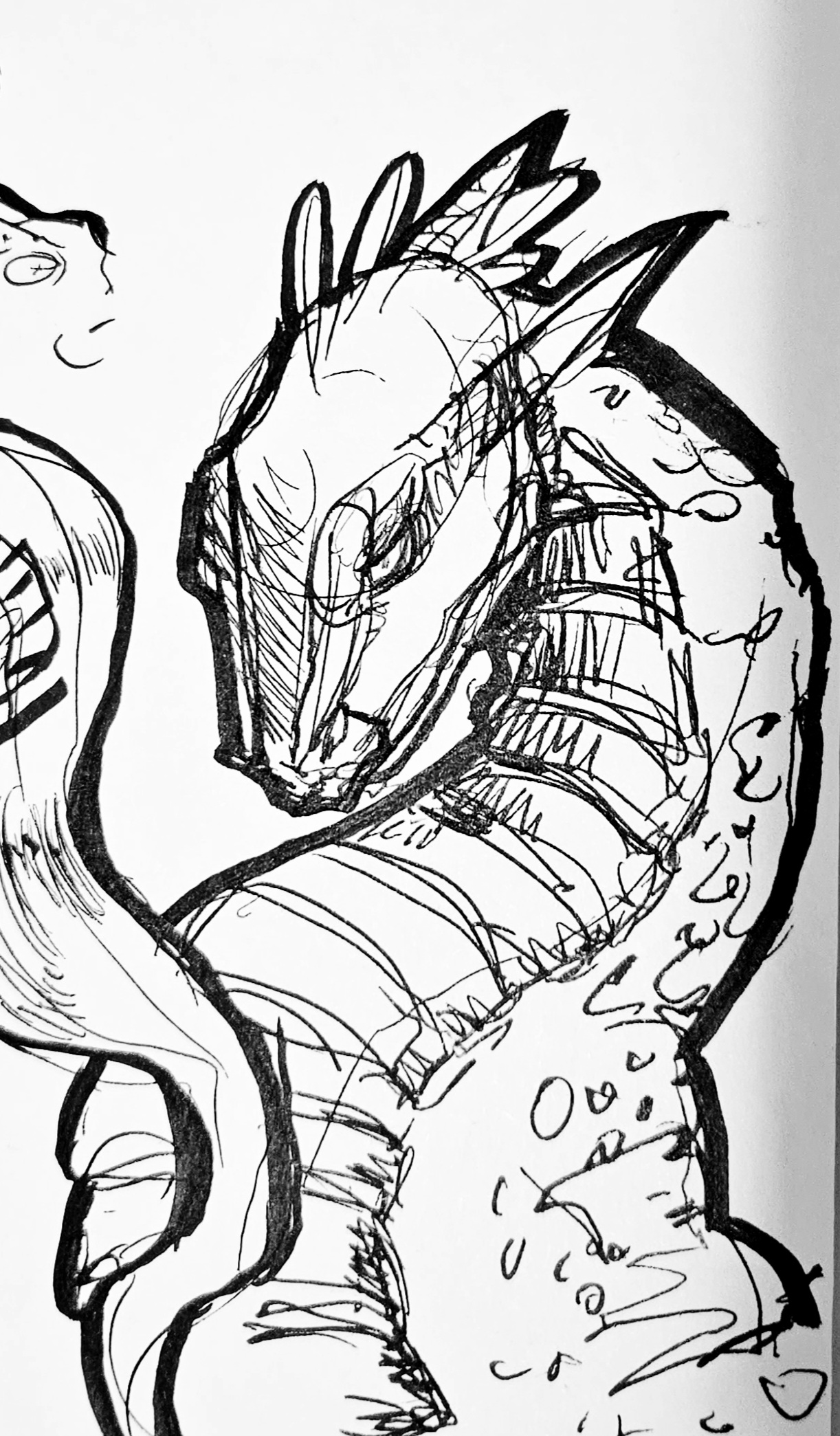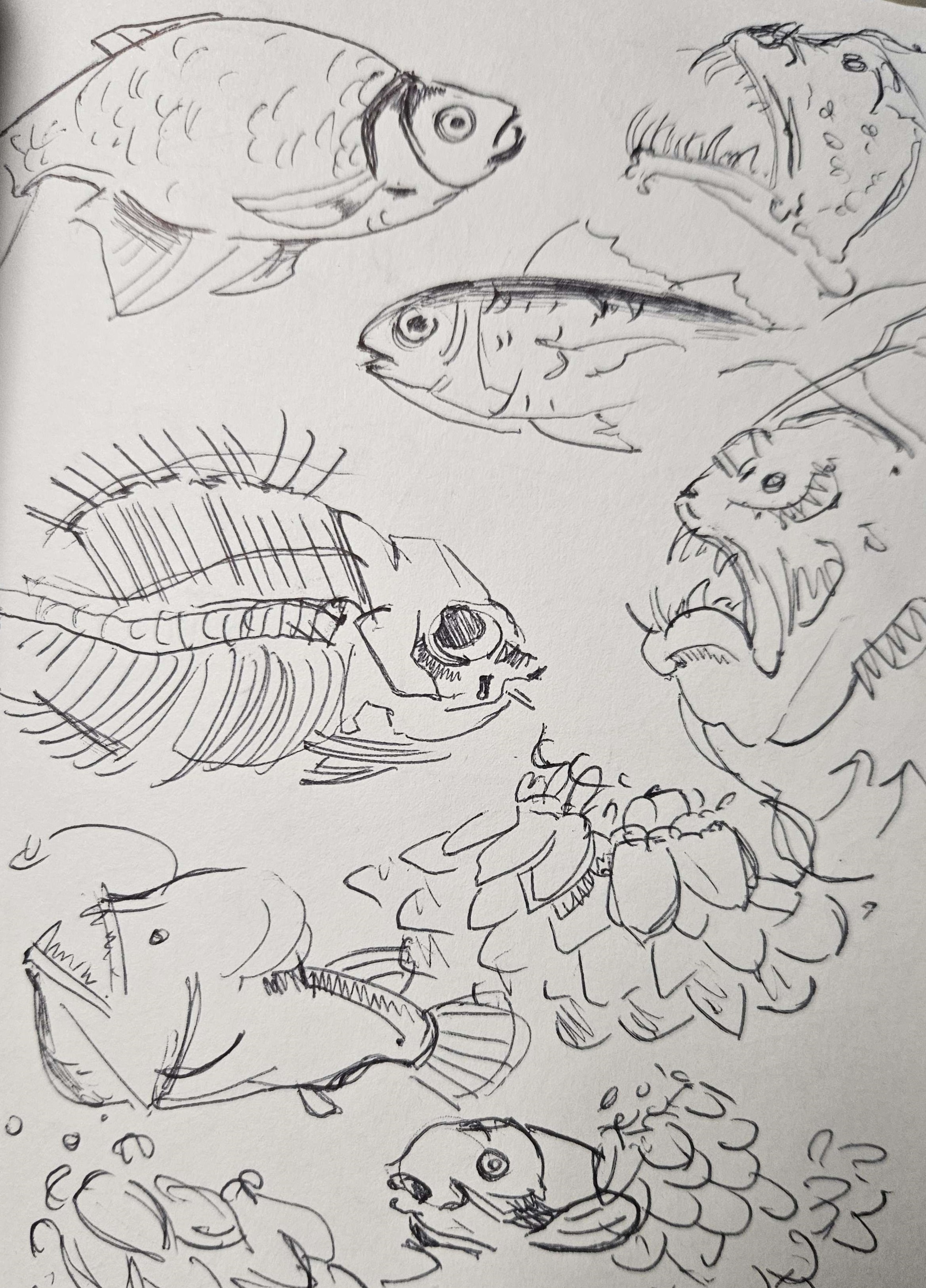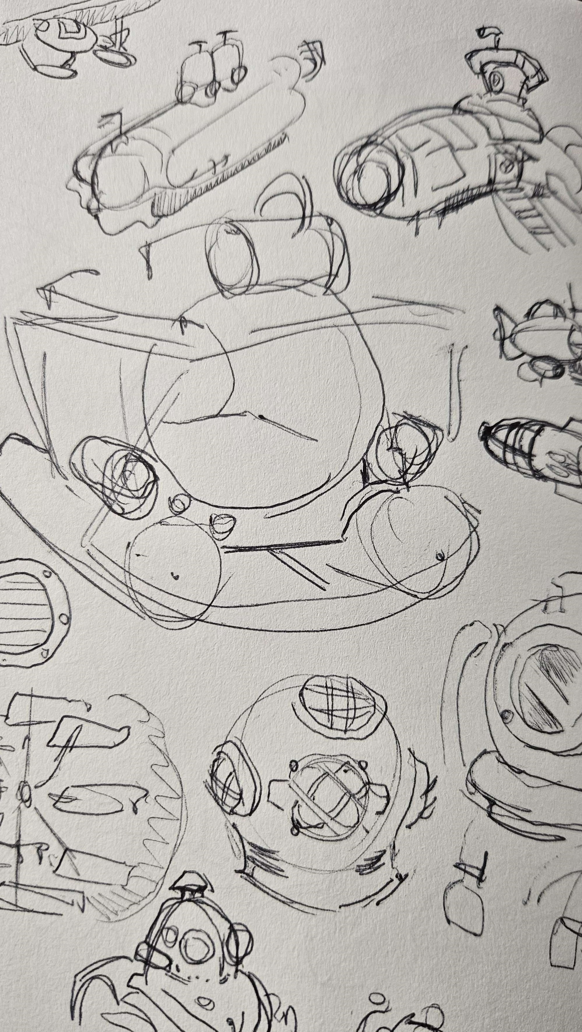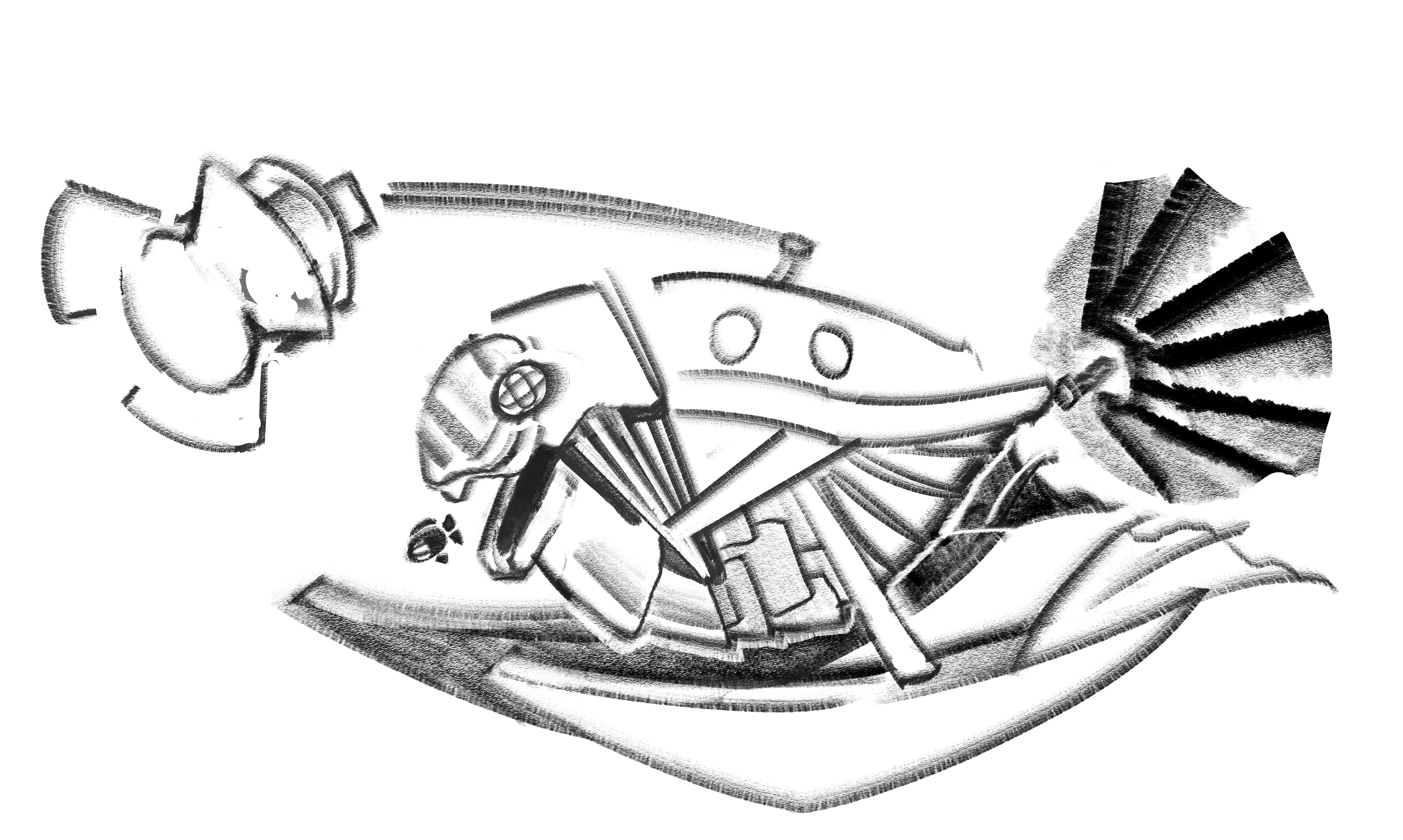 Concept design of a subaquatic vehicle. Partially inspired by the concept of submechanophobia, I aimed to examine connections and intersection between marine life and the brutality of the mechanical. Studies taken from fish, skeletons, machinery, and antique diving equipment were used in preparation.