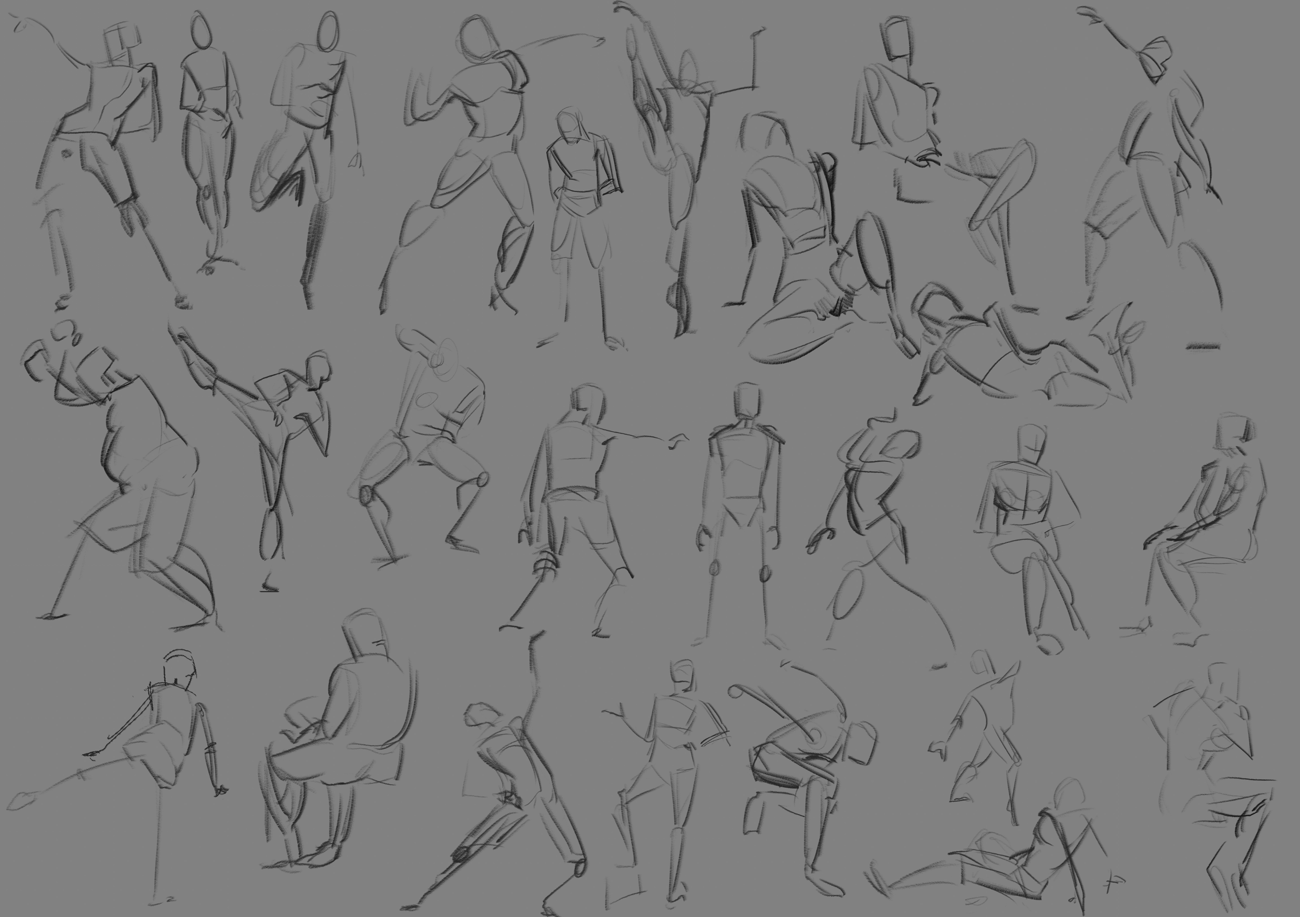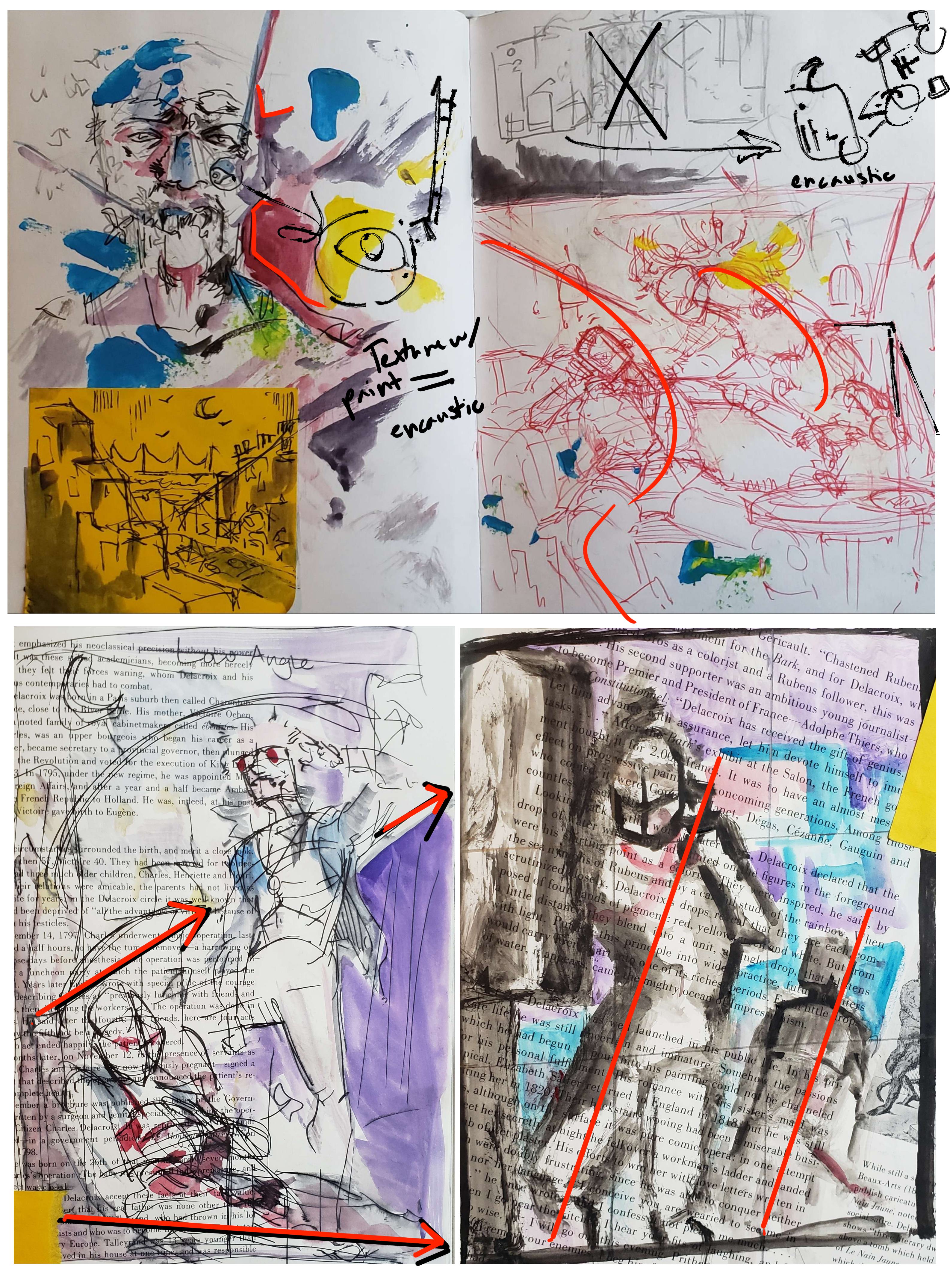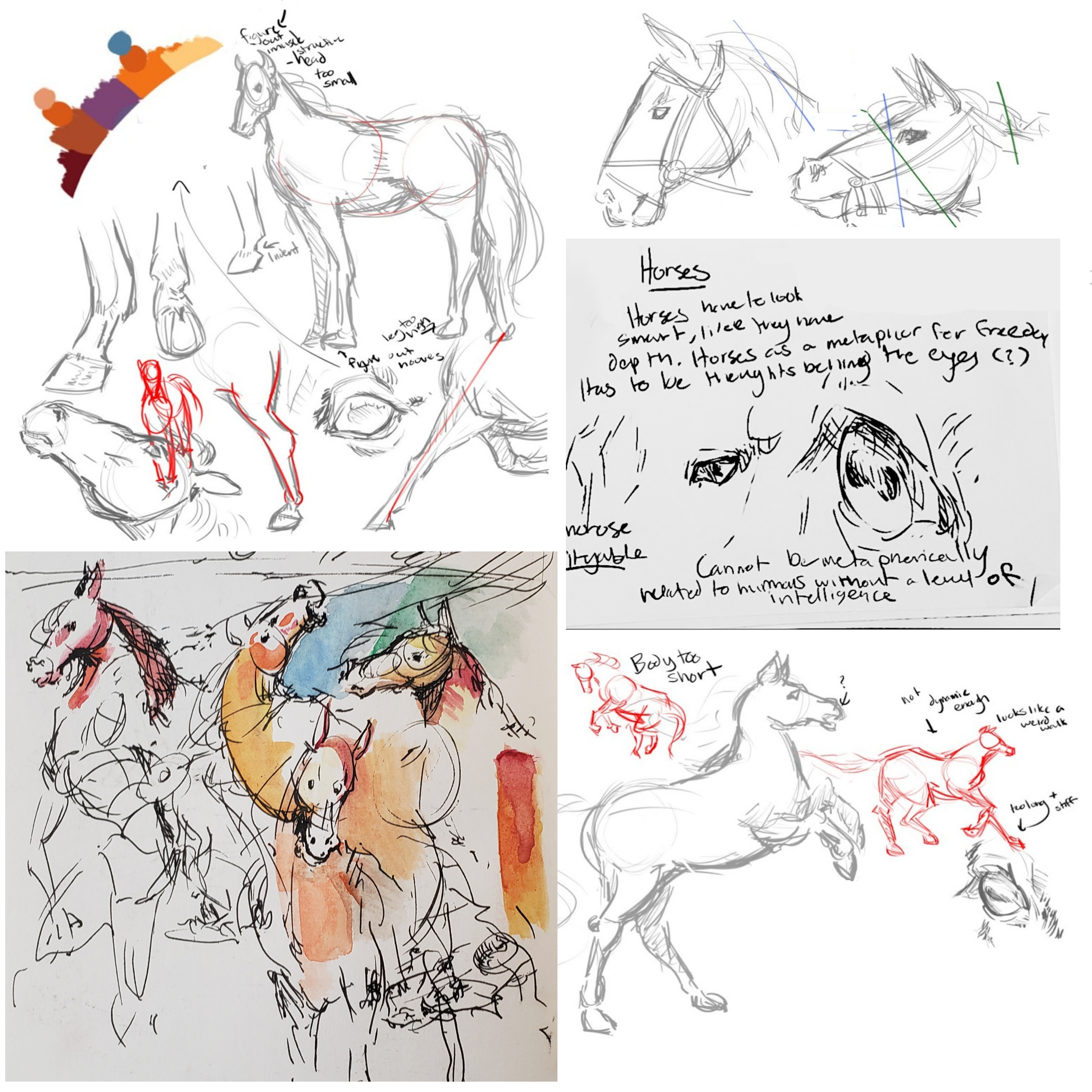 Various sketchbook pages featuring thumbnails, ideation, and studies.